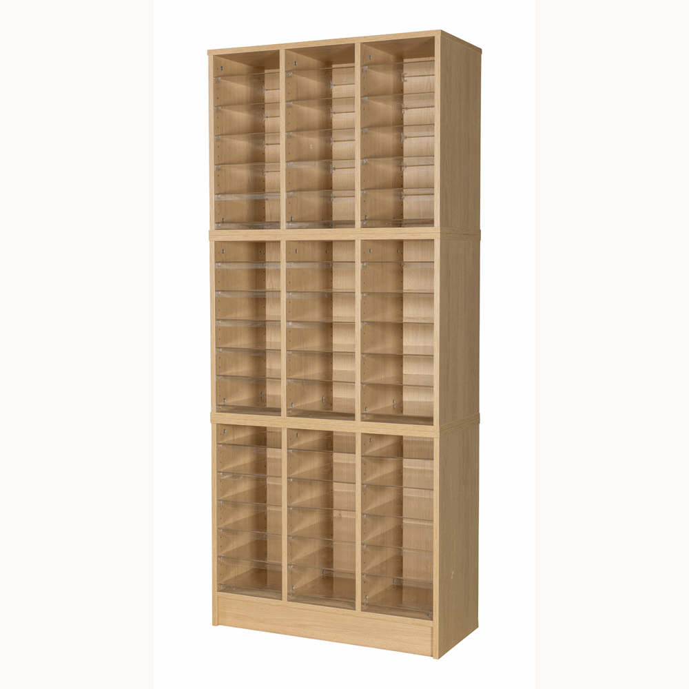 Pigeonhole Unit 54 Spaces 1930H x 826W x 375D designed for organising mail, envelopes, paper in the workplace. Ideal for use in a mail room or reception area. This wooden pigeonhole unit has been made from 18mm MFC (melmine face chipboard). Choose from five laminate colours: Grey, White, Maple, Light Oak or Beech.